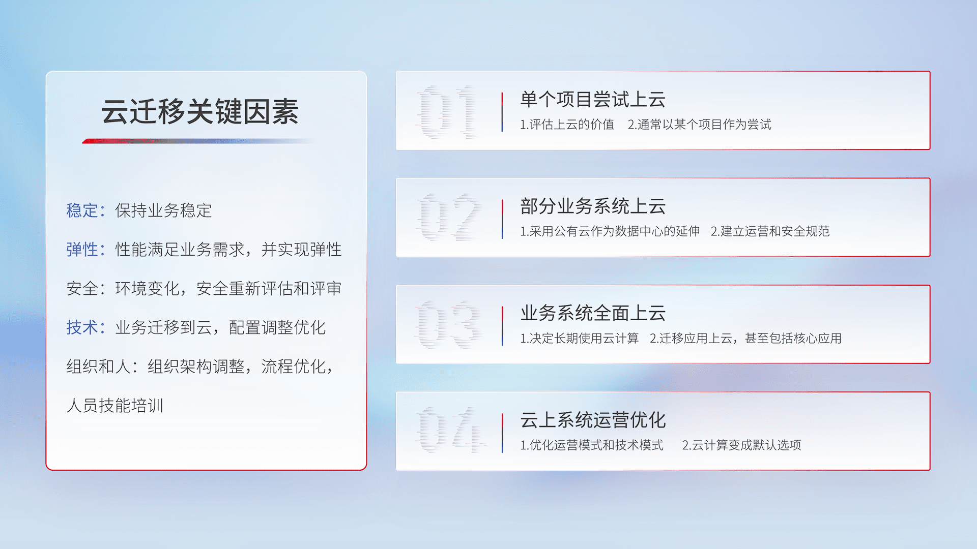 结合实际业务,,,,从规划设计、、云平台选型、、云原生改造、、、数据迁移、、、集成交付,,,,迁移全过程为客户识别最佳上云路径,,做好风险识别管理,,,,设计网络架构、、、、身份权限、、、安全审计合规、、、、操作审计、、、日志审计、、、监控告警策略、、、、多站点容灾设计等,,,,对云上基础设施进行整体规划,,,,提升IT治理水平,,以满足弹性、、高可用、、、、高性能的需求。。